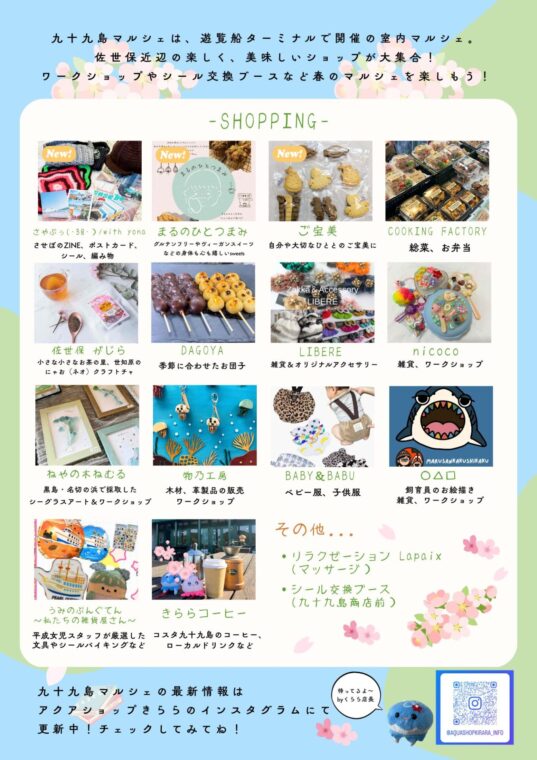 パールシーリゾートでは、九十九島遊覧船ターミナル内休憩所で飲食や雑貨など16店舗が出店する 『九十九島マルシェ』を開催します。 今後3か月ごとに「九十九島マルシェ」の実施を予定していますので、みなさま乞うご期待!