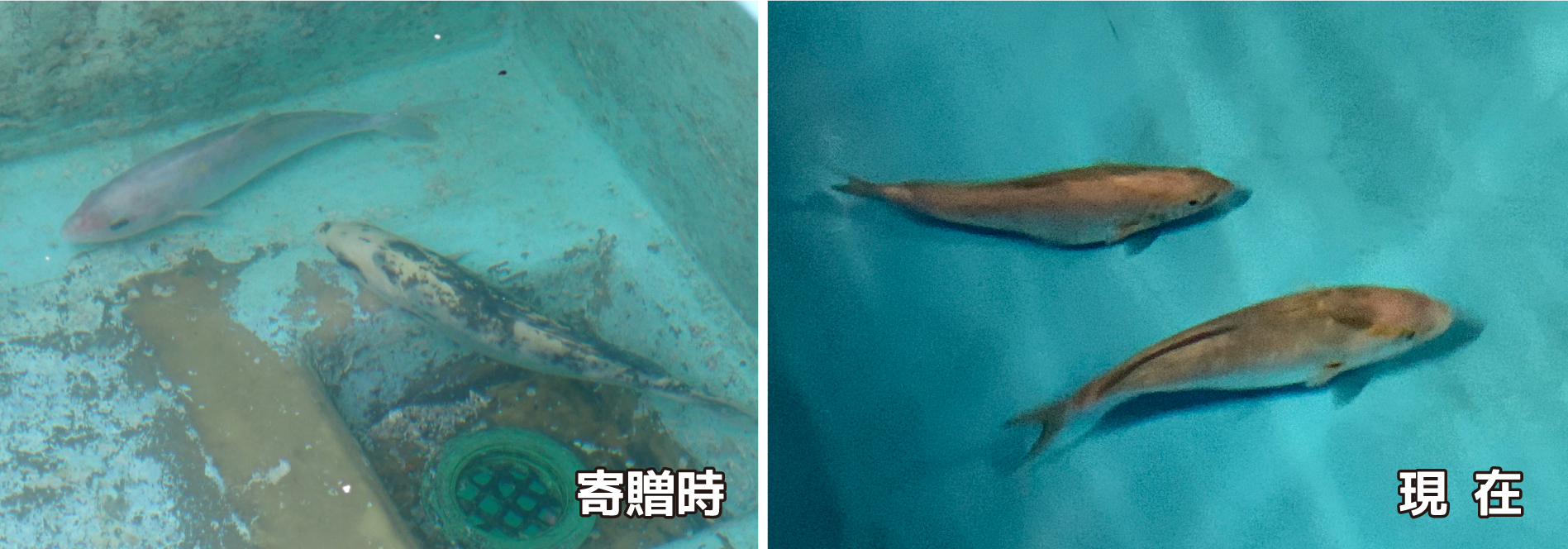 当館の2匹は、上五島町の定置網にかかった個体を寄贈いただいたもので、搬入当初は白みがかった体色でしたが、現在は本来の黄色みを帯びた色に戻りつつあります。